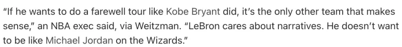 “如果他(詹姆斯)想像科比-布莱恩特那样进行告别之旅,那只有骑士才合情合理。勒布朗很在意叙事,他不想像迈克尔-乔丹在奇才那样退役。”这位高管说道。